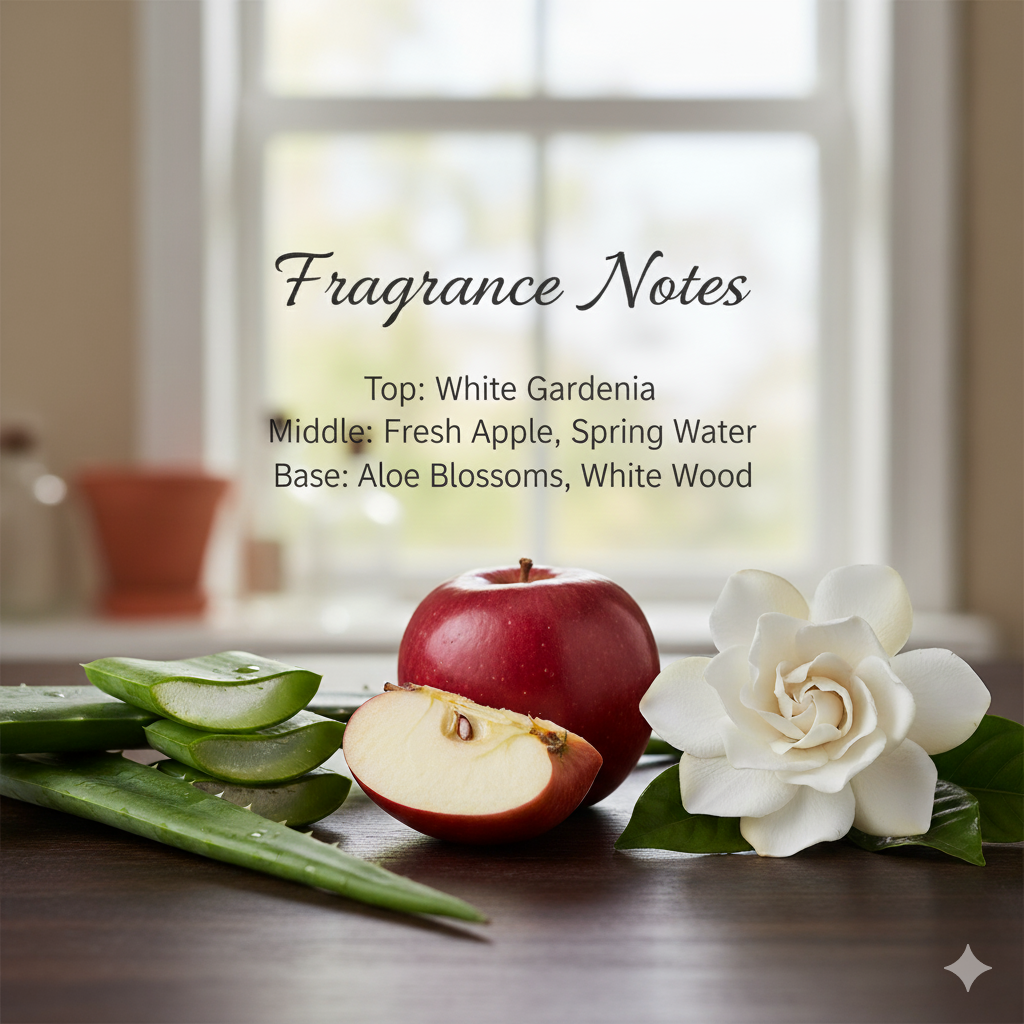Our Aloe Fresh candle brings lovely notes of white gardenia, fresh apple, spring water, aloe blossoms, and white wood to create a rejuvenating and fresh scent. Soothing aloe and the freshness of spring water, creates an atmosphere of tranquility that lingers beautifully.